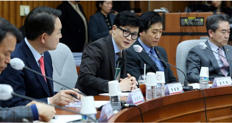 한동훈 법무부 장관이 28일 오후 서울 여의도 국회에서 열린 민ㆍ당ㆍ정협 회의에서 중대 민생침해 금융범죄 대책 및 금융완화 조치 등을 언급하고 있다. , 서울. 맨 오른쪽은 윤희근 경찰청장. /뉴시스