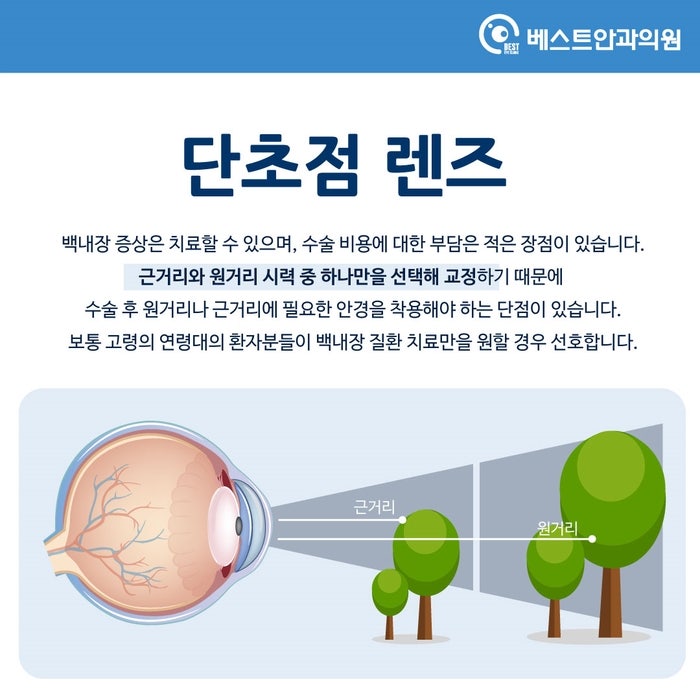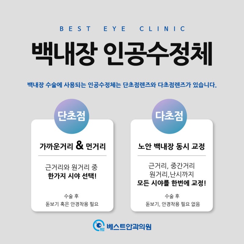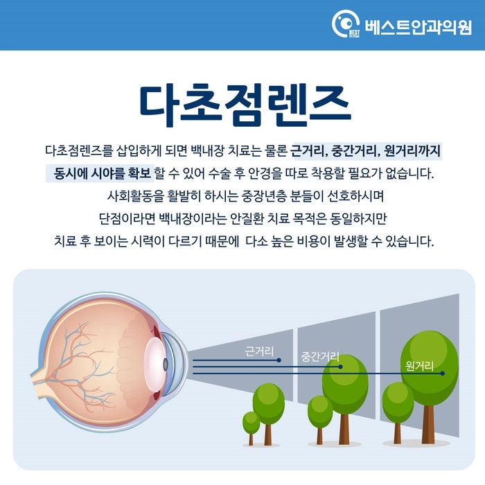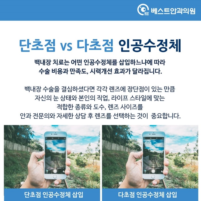 #대구달서구백내장안과_최고 안과백내장은 수정체의 이상으로 인해 시력저하를 일으키기도 합니다. 백내장은 수정체의 무색부분에 백색막이 형성되는 것을 말하며 수정체가 각막에서 들어오는 빛을 굴절시켜 수정체가 하얗게 혼탁하게 보이면 입사광이 산란되어 망막이 정확한 상을 형성하지 못하여 , 시야가 급격히 떨어집니다. 백내장 수술은 조기에 발견하면 미룰 수 있고 일단 발견하면 안약 처방으로 병의 진행을 늦출 수는 있지만 근본적인 치료로는 사용할 수 없다. 시각장애 : 백내장이 진행됨에 따라 일상생활에 불편함이 나타나게 되며, 이를 느끼실 경우 수술을 통해 혼탁한 수정체를 제거하고 인공수정체를 삽입할 시기를 결정하기 전에 안과의사와 상담하시기 바랍니다. 여기서는 단초점 렌즈와 다초점 렌즈의 차이점에 대해 말씀드리겠습니다. #대구달서구백내장안과_최우수안과 단초점렌즈 막연한 백내장 증상을 치료할 수 있고 수술비용 부담을 줄일 수 있다는 장점이 있다. 다만 시력 조절 기능이 없어 근거리 시력과 원거리 시력 중 하나만 선택할 수 있는데, 하나는 안구의 초점이 교정되기 때문에 수술 후 시력교정을 위해 안경을 착용해야 하는 단점이 있고, 일반적으로 노인 환자는 백내장 질환만 치료하는 것을 선호합니다. #대구달서구백내장고안과_최고의 안과용 다초점렌즈 다초점렌즈 삽입 시 노안과 근·중·원거리 시력은 물론 백내장 치료까지 보장해 수술 후 따로 안경을 쓸 필요가 없다. 많은 사람들이 나이가 들면 사회 활동에 적극적으로 참여하기 때문에 중장년층이 선호합니다. 단점은 백내장을 치료하는 목적은 같지만 치료 후 시력이 다르기 때문에 비용이 단초점 렌즈보다 약간 높을 수 있다는 것입니다. #대구달서구백내장안과_최우수안과 백내장 수술을 결정하셨다면 렌즈마다 장단점이 있으니 본인의 눈 상태, 직업, 생활습관에 맞는 종류와 도수, 렌즈 사이즈 등을 충분히 고려하여 안과 전문의와 상의하시기 바랍니다. 올바른 렌즈를 선택하는 것이 가장 중요합니다. 현재 본인이나 부모님이 백내장으로 고생하고 계시다면 대구베스트안과의원에서 상담을 받아보시길 바랍니다. 감사해요. 대구광역시 남구 월배로 470 KC빌딩 401호 베스트안과 201호 대명역 성당동 본리동 안지랑역 현충로역)