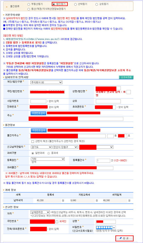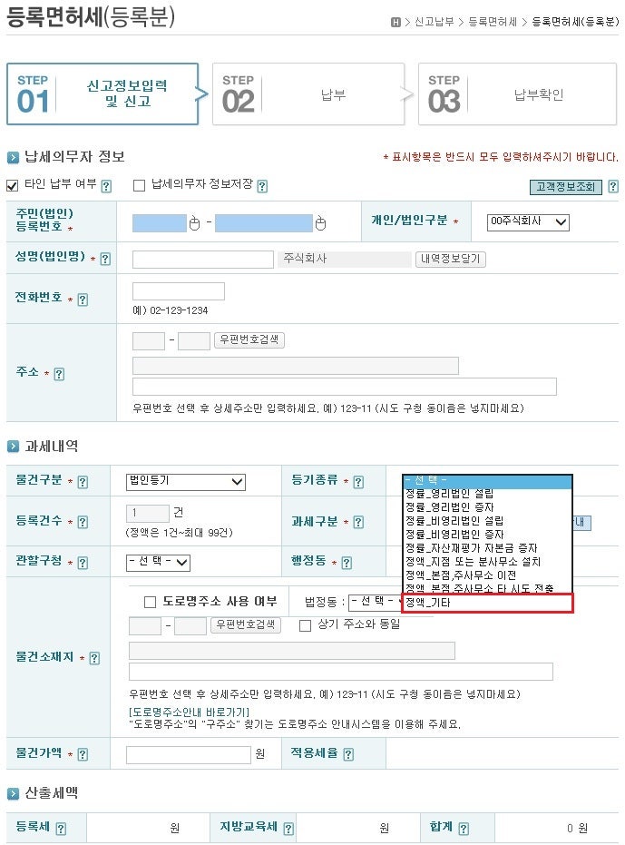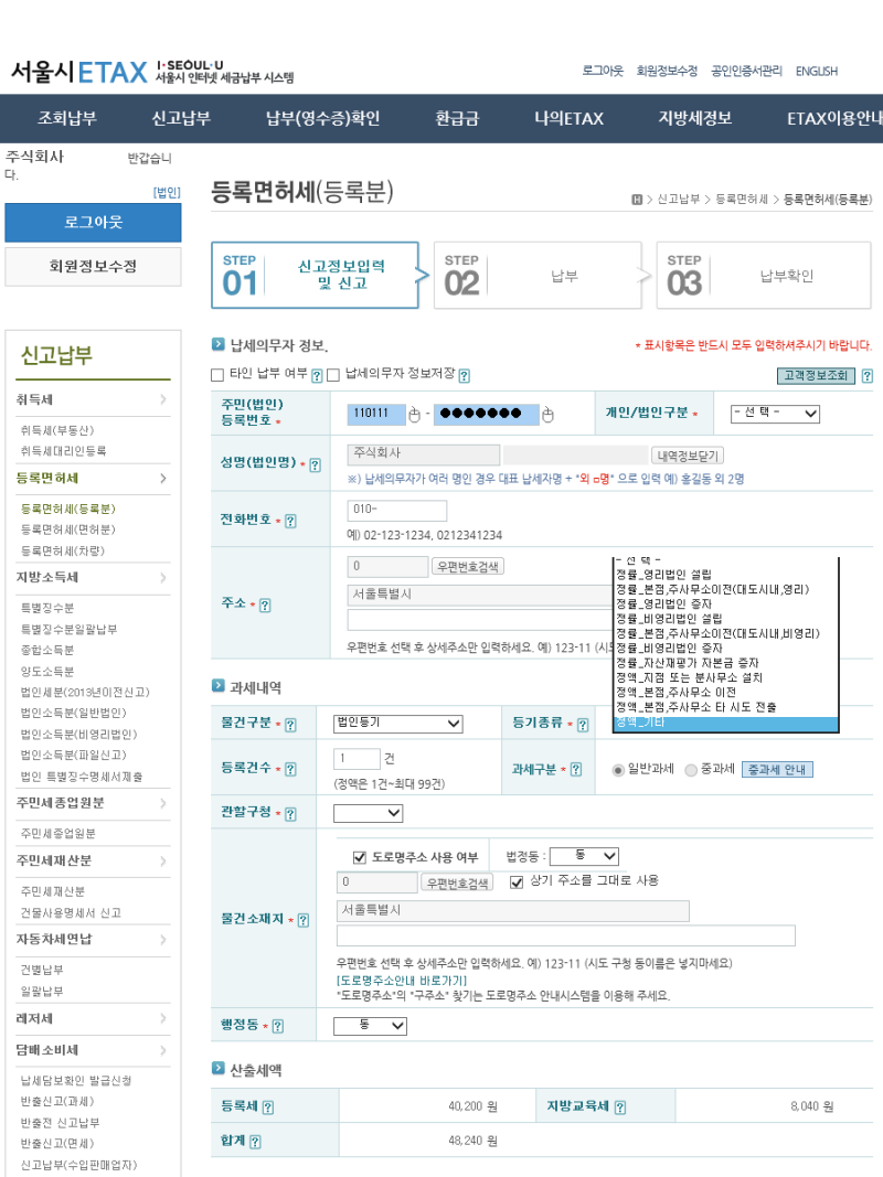 개인/법인 구분 란에 자신의 법인에 해당하는 것을 선택합니다. 예를 들면 주식 회사 삼성 전자 라면 주식 회사 00을 택하면 되고, 삼성 전자 주식 회사 라면 00주식 회사를 선택하시면 됩니다.아마 이미 위 조세에 가입하고 있으면, 대부분의 내용이 자동으로 입력됩니다. 공란을 추가로 입력합니다.물건의 종류-법인을 입력합니다.물건 선주소-납세자 주소의 복사를 클릭하면 자동적으로 주소가 입력됩니다.만약 법인 소재지가 서울 등 과밀 억제 권역인면 중과세에 대한 안내가 나옵니다. 그래도 법인 임원 변경에 대한 등록 면허세는 정액이라 중과 무시하고 일반 과세를 클릭합니다.과세 정보 탭의 등록 원인은 기타를 선택합니다. 이를 선택해야 위에서 일반 과세를 선택하기에 문제는 없습니다. 과세 물건은 법인의 주소를 기입하세요.과세 표준액은 40,200원입니다. 나머지 지방 교육세는 자동적으로 입력됩니다.만약 금액이 궁금하다면 법인 소재지구청 세무과로 문의 주세요.확인이 끝나면[신고]을 클릭합니다.