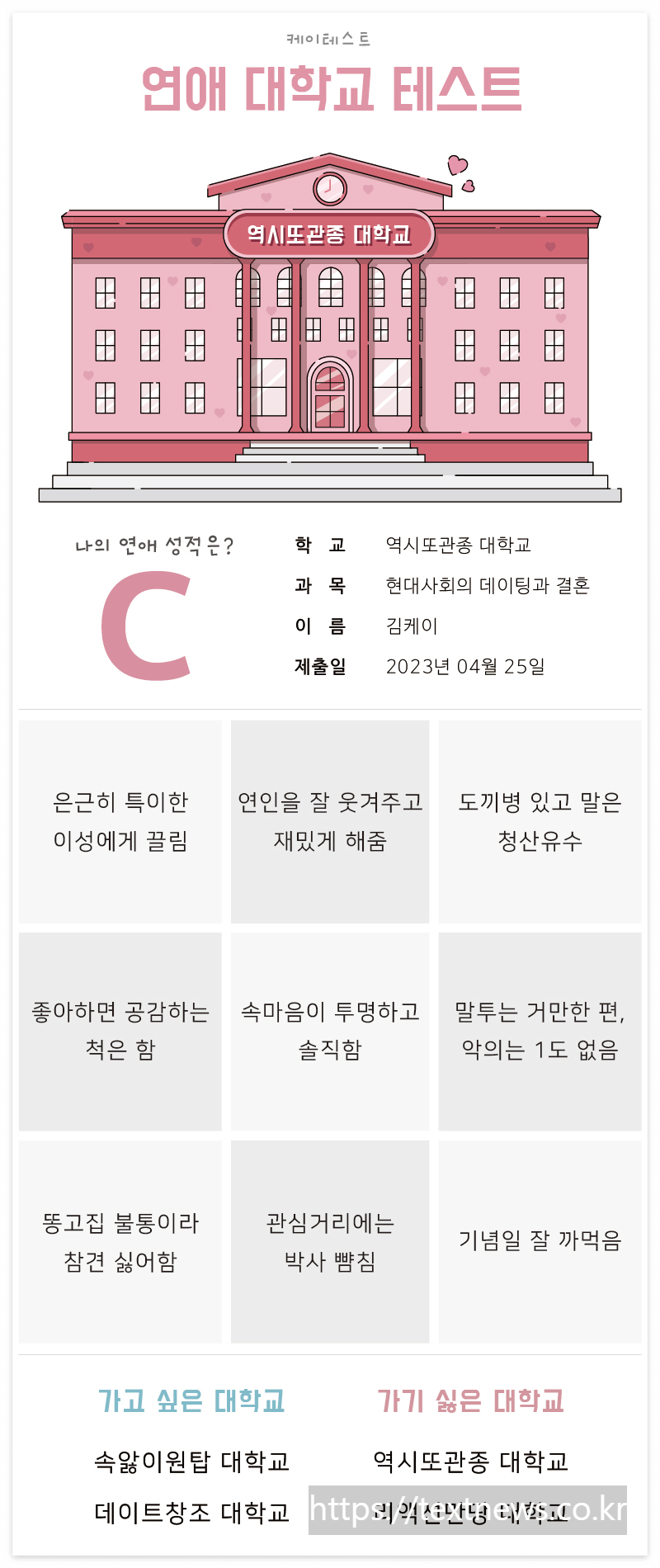 질문마다 진지한 답변이 필요해 마치 실제 학교 홈페이지에서 적성검사를 받는 기분이었다. 생각보다 정확한 사랑평을 받아 기분이 좋았다. 아직 사랑대학교 시험을 치르지 않으신 분은 아래 링크를 통해 응모해주세요.