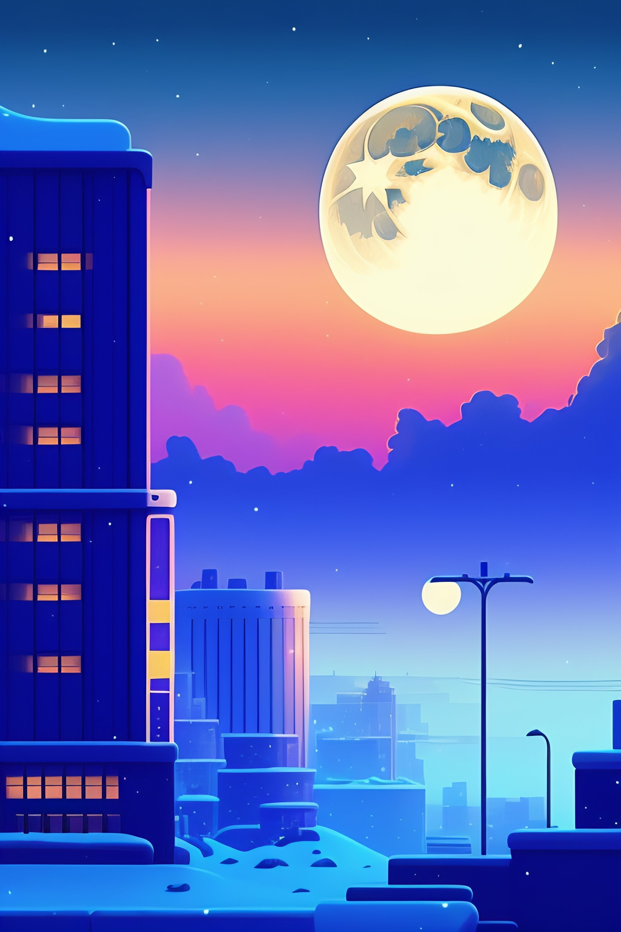 만화, 디지털 미술로파이 스타일, 건물, 가득한 달, 우우 천국, 강설