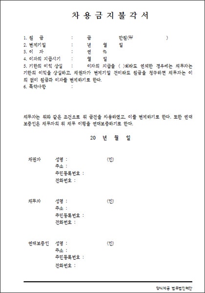법률전문수집회사인 신용정보회사의 징수를 의뢰·접수하고 채무자 재산조회와 신용조회를 신청해 강제집행의 근거가 되는 정보를 수집하는 데도 활용됩니다. 또한 본압류 전에 채권보전처분인 가처분신청 또는 가압류신청을 할 때 증거서류로 사용할 수 있습니다. 다만 공증된 공정증서가 확보되면 신속한 강제집행이나 소송 생략, 가압류 등을 통해 청구권을 회수할 수 있고, 사실상 지급각서는 징수과정 전반의 토대가 되는 우수증서인 셈이다.채무 추심의 본질을 입증하기 위해 지불 각서를 충분히 활용할 전문 컨설턴트에게 문의하십시오. 당신은 당신이 알고 싶은 것만 상담할 수 있습니다. 언제든지 상담해 주시면 귀중한 재산을 회수해 드리겠습니다.