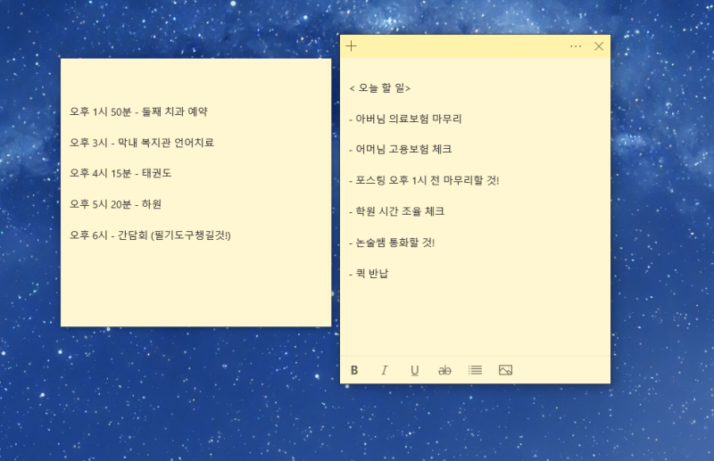 3. 설치 후 다시 윈도우 검색창에 (스티커)를 입력하면 (스티커 메모장) 앱이 나옵니다.실행합니다.컴퓨터 메모장 고정하기 1. 앱을 실행할 때마다 검색하기 번거롭습니다.컴퓨터 메모장을 고정하려면 앱을 실행하기 전에 마우스 오른쪽 버튼을 클릭하면 (시작 화면에 고정)과 (작업 표시줄에 고정) 메뉴가 있습니다.작업 표시줄에 고정은 실행할 때만 작업 표시줄에 표시되는 기능입니다.시작 메뉴에 보이게 하려면 (시작 화면에 고정)을 선택하세요.컴퓨터 메모장 사용 방법 1. 컴퓨터 메모장 앱을 실행하면 위 그림과 같이 나옵니다.왼쪽의 흰색 배경이 목록입니다.오른쪽의 노란색 배경이 입력하는 컴퓨터 메모장입니다.2. 노란색 배경에 정보를 입력합니다.그러면 자동으로 목록에 만들어집니다.목록을 보면 메모를 쓴 날짜와 시간이 자동으로 기록됩니다. 3. 노란색 포스트잇 하단에는 6개의 메뉴가 있습니다. 드래그하여 텍스트를 편집할 수 있습니다. 왼쪽부터 텍스트 굵게, 기울임꼴, 밑줄, 취소선, 글머리 기호, 사진 첨부 기능입니다. 4. 6번째에 있는 이미지 첨부 메뉴를 클릭하면 내 컴퓨터에 이미지를 추가할 수 있습니다. 노트와 목록에 바로 표시됩니다. 표시된 이미지를 마우스 오른쪽 버튼으로 클릭하면 이미지를 더 큰 크기로 보거나 삭제하거나 저장할 수 있습니다. 5. 여러 개의 노트를 추가할 수 있습니다. 기존 포스트잇을 클릭하면 왼쪽 상단의 +아이콘을 클릭하여 클릭한 포스트잇과 같은 색상과 크기의 포스트잇을 추가합니다. 그런 다음 오른쪽 상단의 세 개의 점 아이콘을 클릭하면 노트를 삭제하고 포스트잇의 색상을 변경할 수 있습니다. 6. pa 노트패드 포스트잇의 크기를 조절할 수 있으며, 색상/크기를 조절한 노트에서 추가 버튼을 클릭하면 동일한 노트가 추가됩니다. 삭제하려면 오른쪽 위에 있는 X를 클릭하세요. 7. 포스트잇이 많이 추가되면 목록에 나타납니다. 특정 노트를 찾고 싶다면 목록 맨 위에 있는 검색창을 이용하세요. 특정 단어를 입력하면 해당 단어가 포함된 노트만 표시됩니다. 8. x를 눌러 닫고 다시 로드하면 앱을 다시 실행하면 마지막으로 저장된 내용이 그대로 로드됩니다. 목록을 다시 보고 싶다면 앱에서 마우스 두 버튼을 눌러 목록 메뉴를 선택하세요. 이렇게 하면 손으로 입력할 때처럼 종이를 잃어버리지 않고, 입력 날짜를 헷갈리지 않으며, 색상으로 구분할 수 있어 더욱 편리합니다. 또한 텍스트 편집 기능으로 중요한 내용을 빠르게 확인할 수 있습니다. 여러모로 편리해서 잘 사용하고 있습니다. 동기화 방법 1. Microsoft One Note를 통해 메모장을 동기화할 수 있습니다. 앱을 마우스 오른쪽 버튼으로 클릭하고 (설정)으로 들어갑니다. 그런 다음 로그인 후 휴대폰에 Microsoft One Note 앱을 설치하고 동일한 ID로 로그인하면 컴퓨터와 동기화되어 휴대폰에서 확인하고 편집할 수 있습니다. 위의 과정은 비디오에서 확인할 수 있습니다.